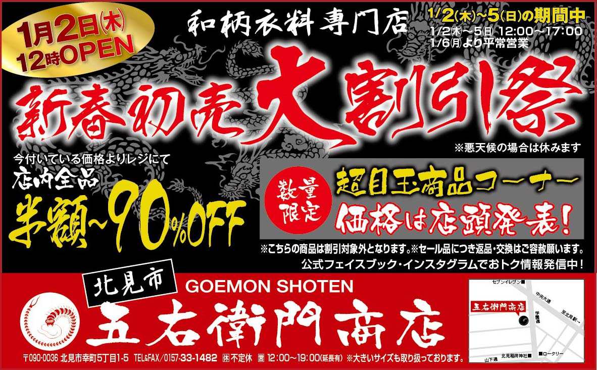 - 新春初売りは、1/2~1/8 12:00~17:00までの営業となっております。
